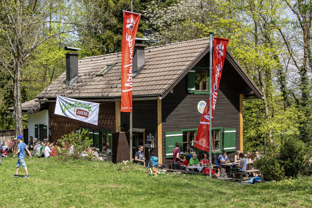 Wir kommen zur Zistelalm zurück und gehen dann ca 15 Gehminuten hinunter zur Rauchenbühelhütte der Naturfreunde Salzburg, direkt auf der Grenze zwischen der Stadt Salzburg und Elsbethen.